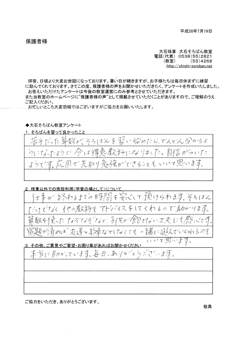 とても満足しています。子供たち(特に長男)は何かを始めるごとにグズグズいうのですが、そろばんは楽しくいってくれるのでありがたいです。今後ともよろしくお願いいたします。(悪いことしたらドンドン叱って下さい。)